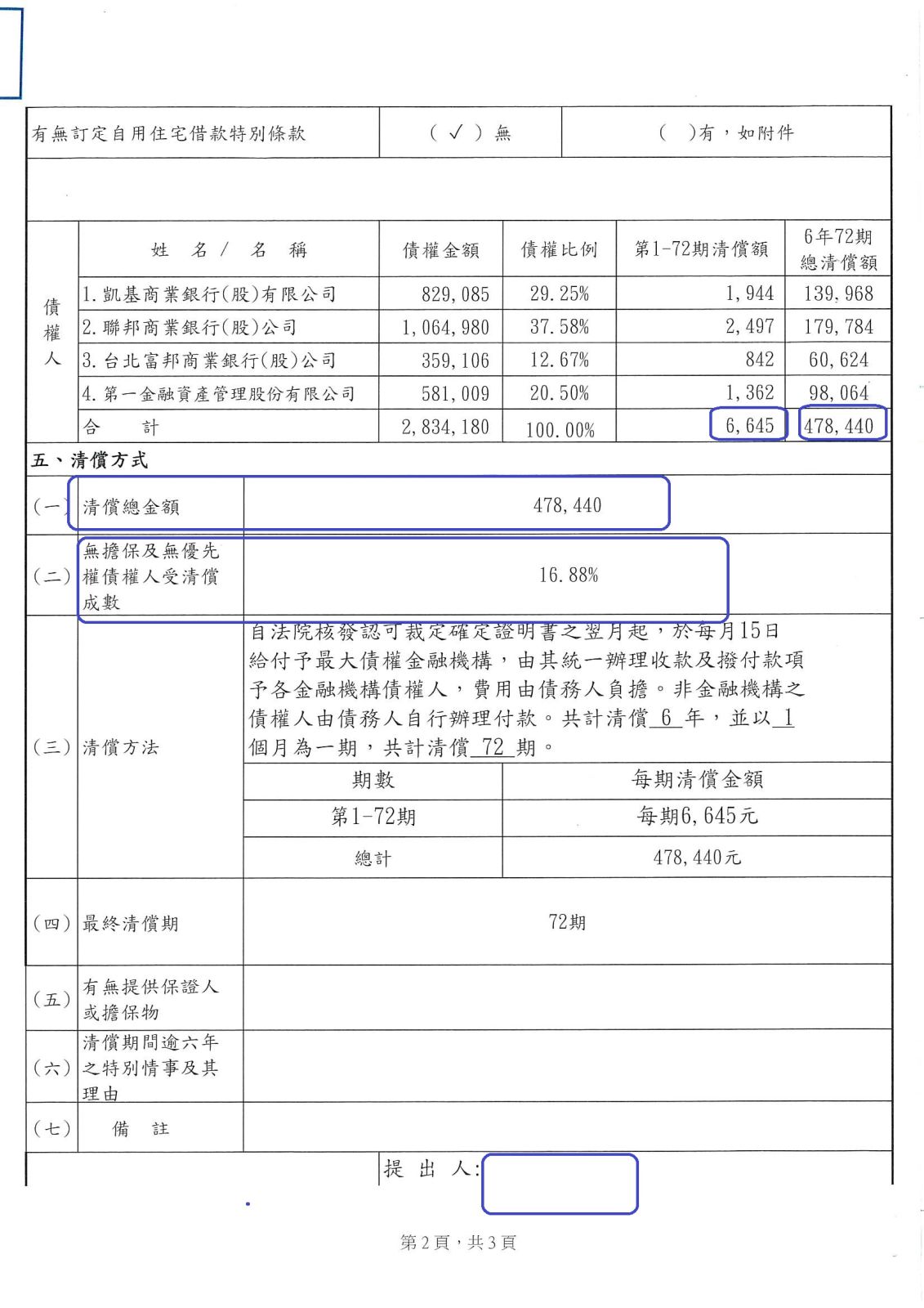 【債務更生案例】 王先生負債總額283萬4180元,法院更生成立後每月還款6,645元,6年還款總額47萬8440,清償比例:16.88%