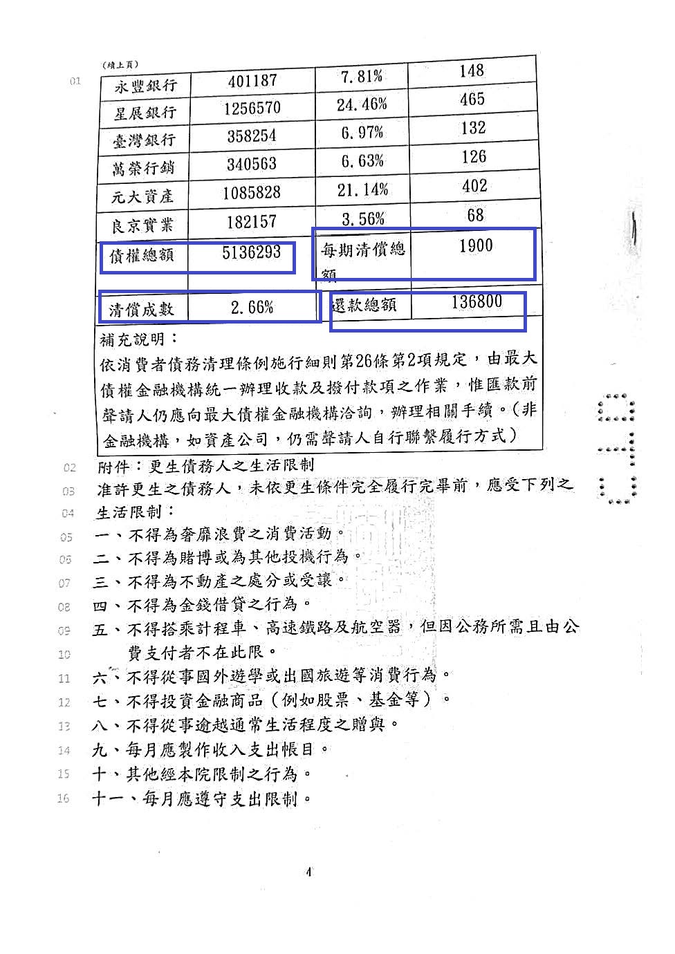【前置協商案例】- 李先生債務約136萬,5間銀行每月繳納銀行最低應繳額約4萬3,整合協商後每月還款1萬3600元。