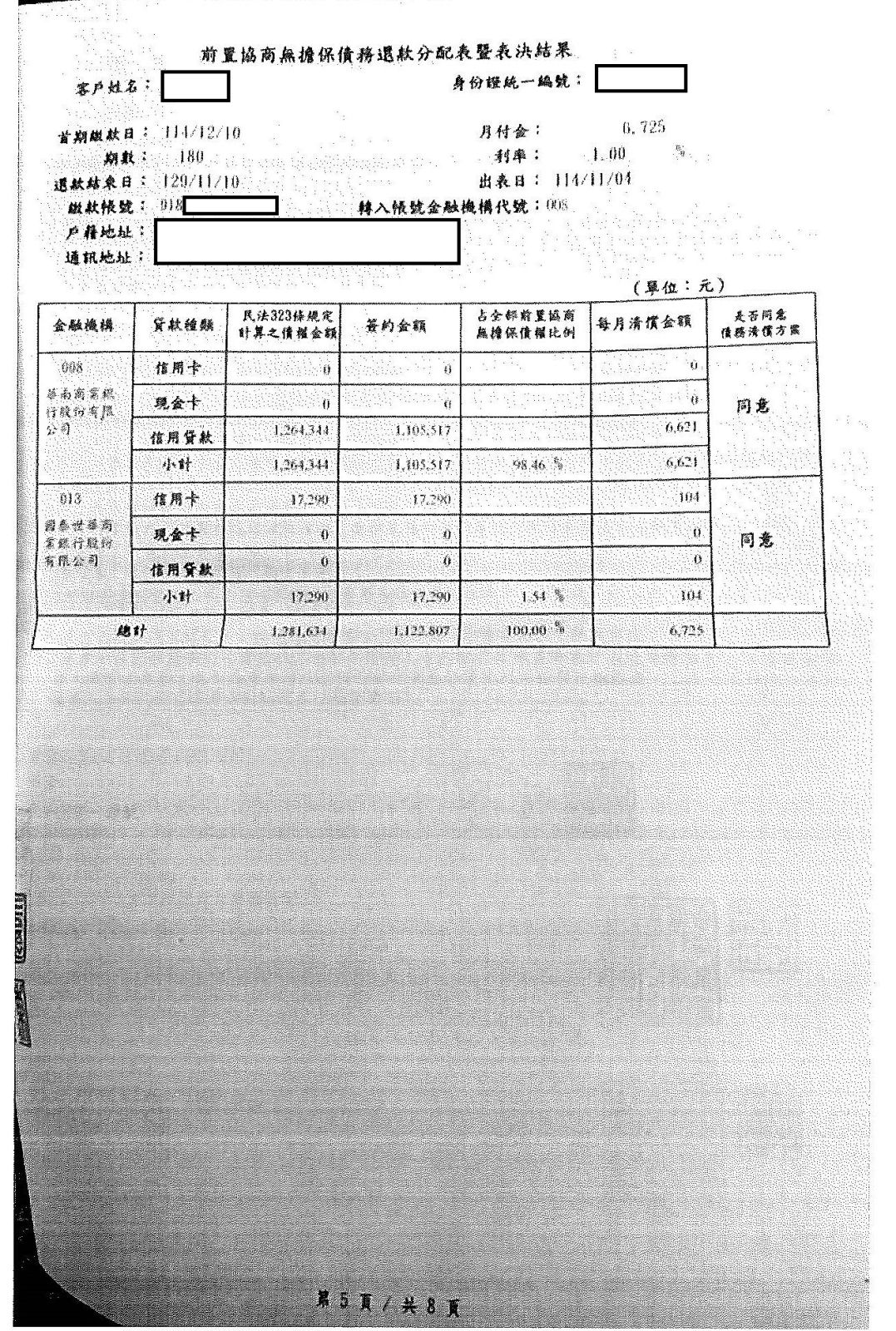 【前置協商案例】- 樊先生本金加利息負債約457萬5661元,前置協商後減免8年來利息,以本金128萬7802元還款,每月還款8893元。