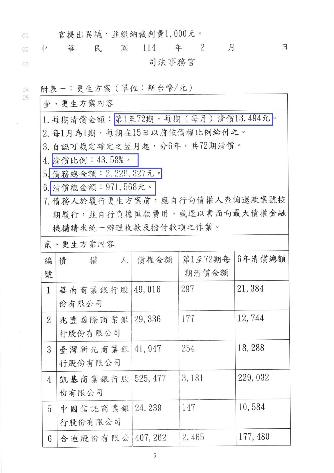 【債務更生案例】 白先生負債總額222萬9327元,法院更生成立後每月還款13494元,6年還款總額97萬1568,清償比例:43.58 %