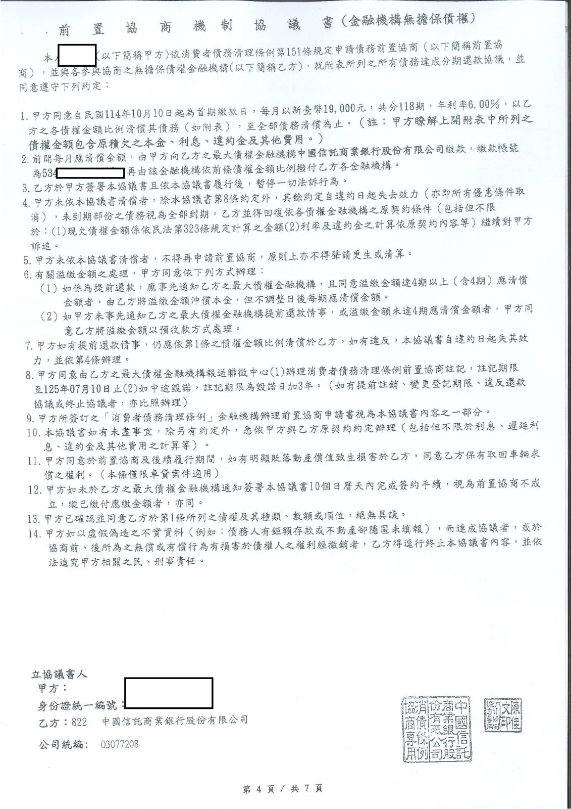 【前置協商案例】- 吳先生債務約112萬3459,每月繳納各家最低應繳額約4萬2,整合協商後每月還款1萬3元。