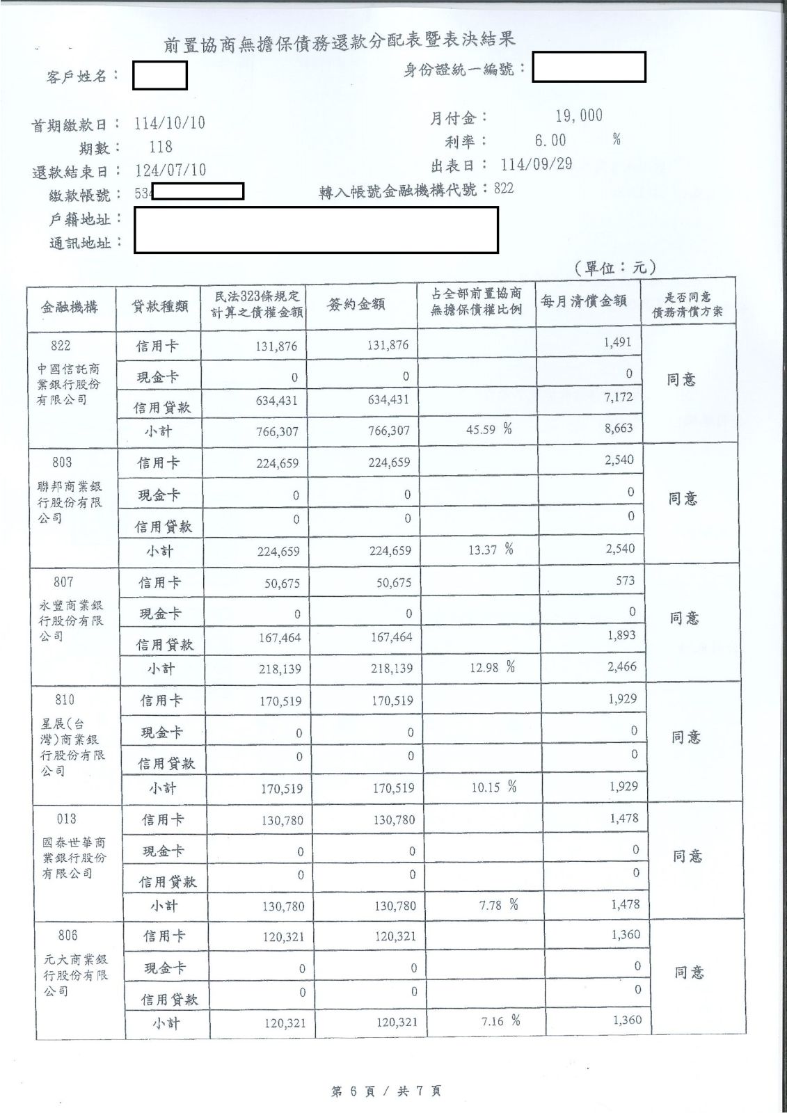 【債務更生案例】 廖小姐負債總額110萬1642元,法院更生成立後每月還款1,000元,6年還款總額7萬2000,清償比例:6.53%