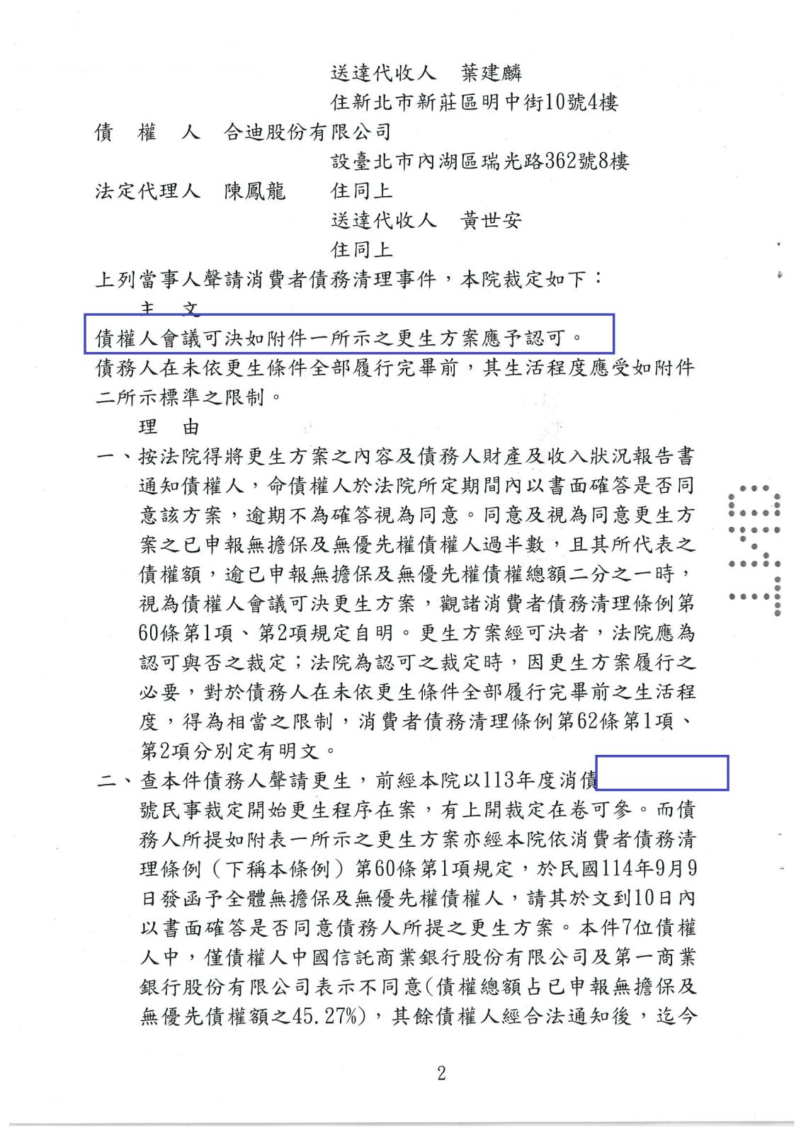 更生裁定日期:114年09月