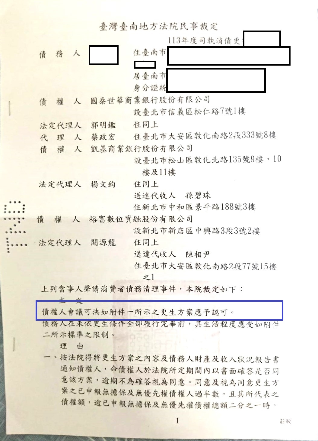 【債務更生案例】 劉先生負債總額1035萬8824元,法院更生成立後每月還款1800元,6年還款總額7萬2,清償比例:1.25 %