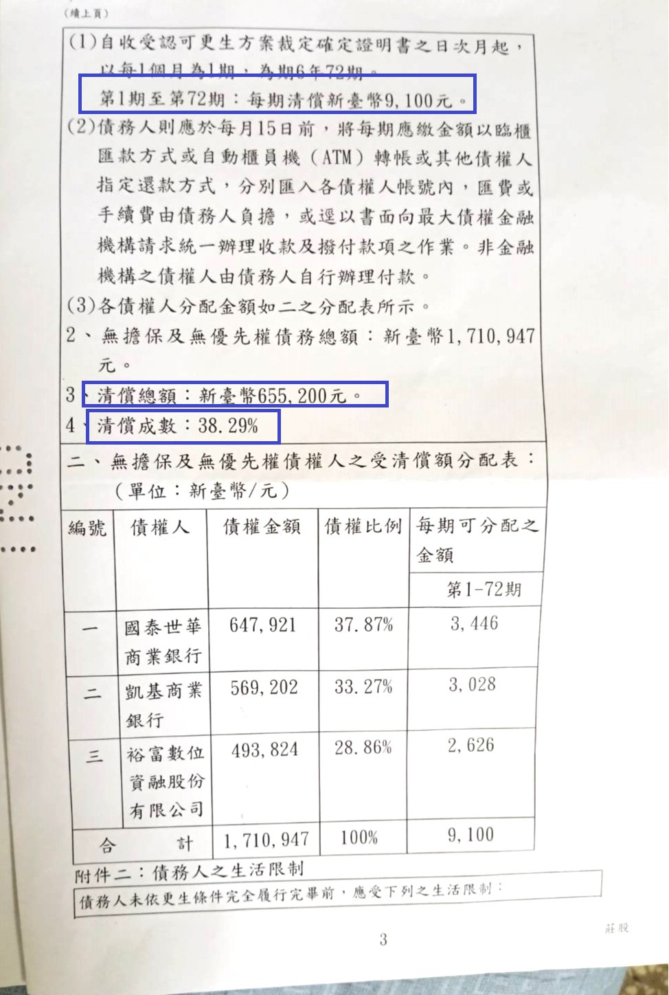 【債務更生案例】 呂小姐負債總額171萬947元,法院更生成立後每月還款9,100,6年還款總額65萬5200,清償比例:38.29 %