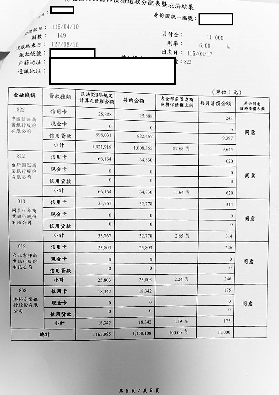 【前置協商案例】- 李先生債務約136萬,5間銀行每月繳納銀行最低應繳額約4萬3,整合協商後每月還款1萬3600元。