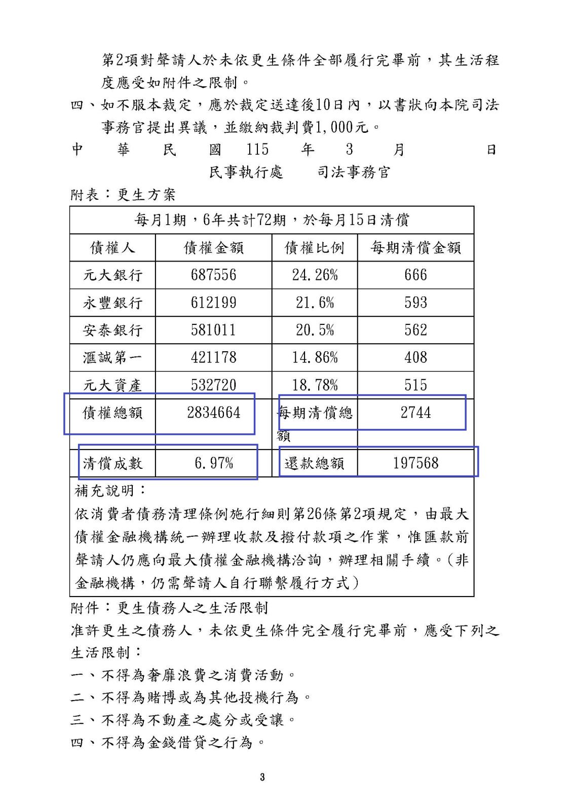 【債務更生案例】 林小姐負債總額283萬4664元,法院更生成立後每月還款2744元,6年還款總額19萬7568元,清償比例:6.97 %