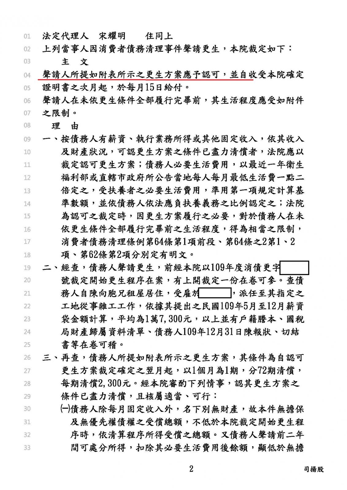 【債務更生案例】 劉先生負債總額1035萬8824元,法院更生成立後每月還款1800元,6年還款總額7萬2,清償比例:1.25 %