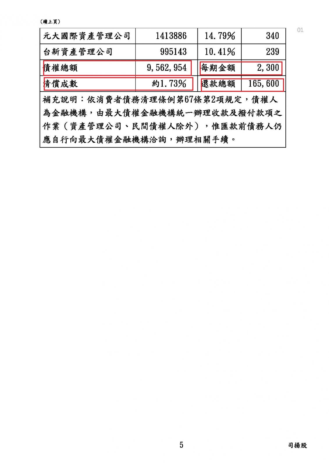 【債務更生案例】 潘小姐負債總額513萬6293元,法院更生成立後每月還款1,900元,6年還款總額13萬6800,清償比例:2.66%