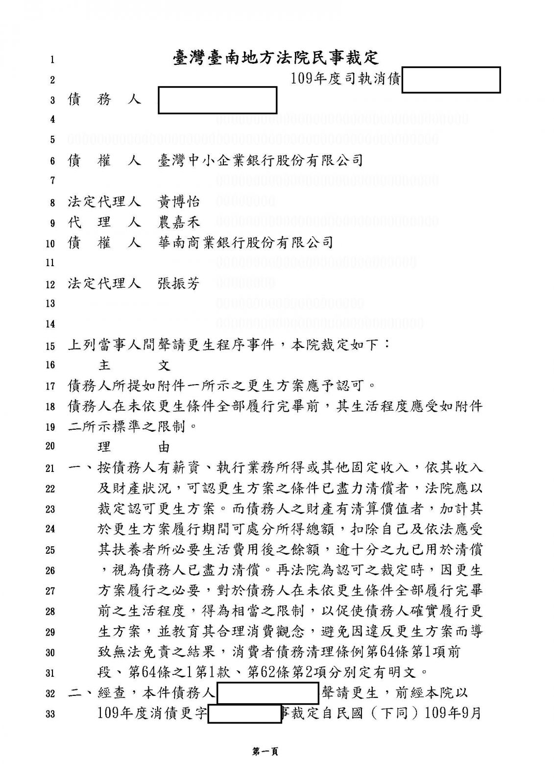 為解決債務問題依據消費者債務清償條例,向台南地方法院聲請更生程序,