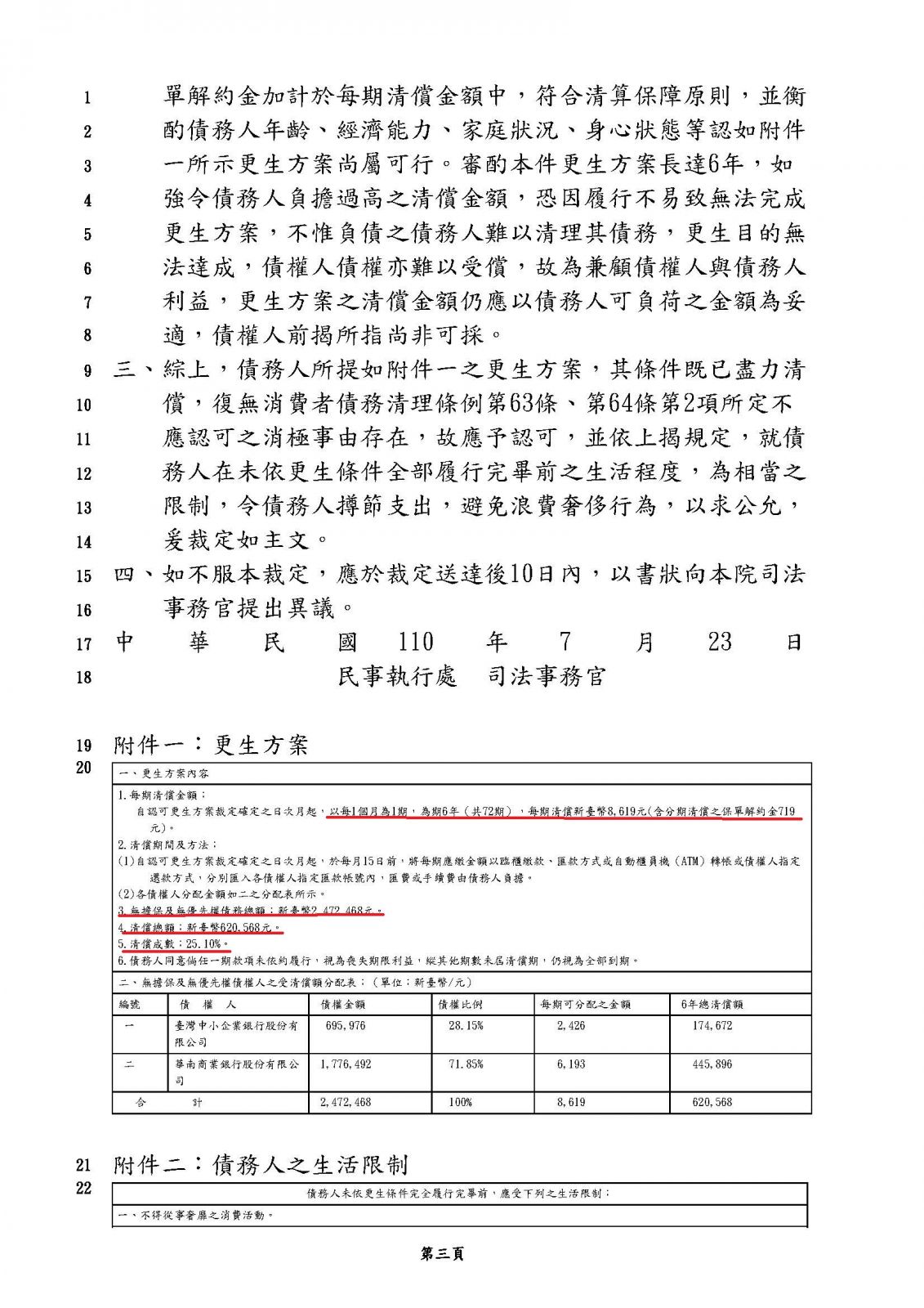 更生裁定日期:110年07月23日