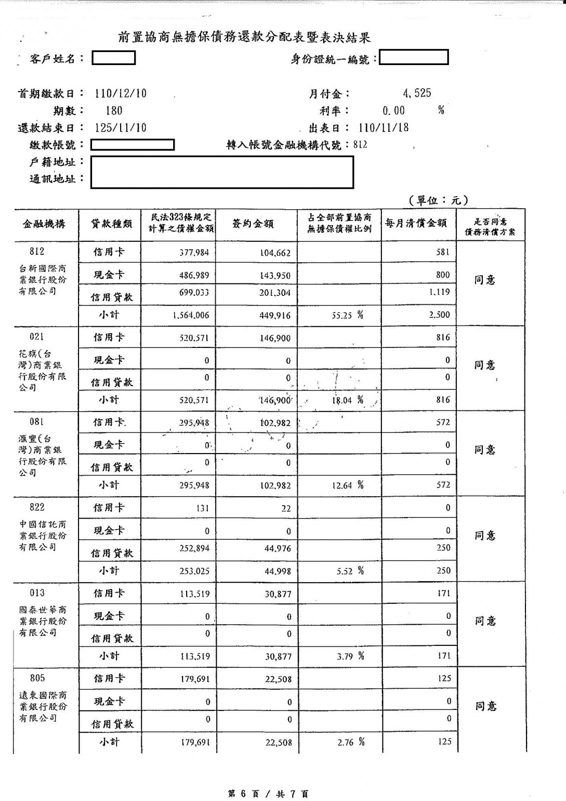 【前置協商案例】- 范小姐債務約112萬,2間銀行每月繳納銀行最低應繳額約1萬8,整合協商後每月還款6,725元。