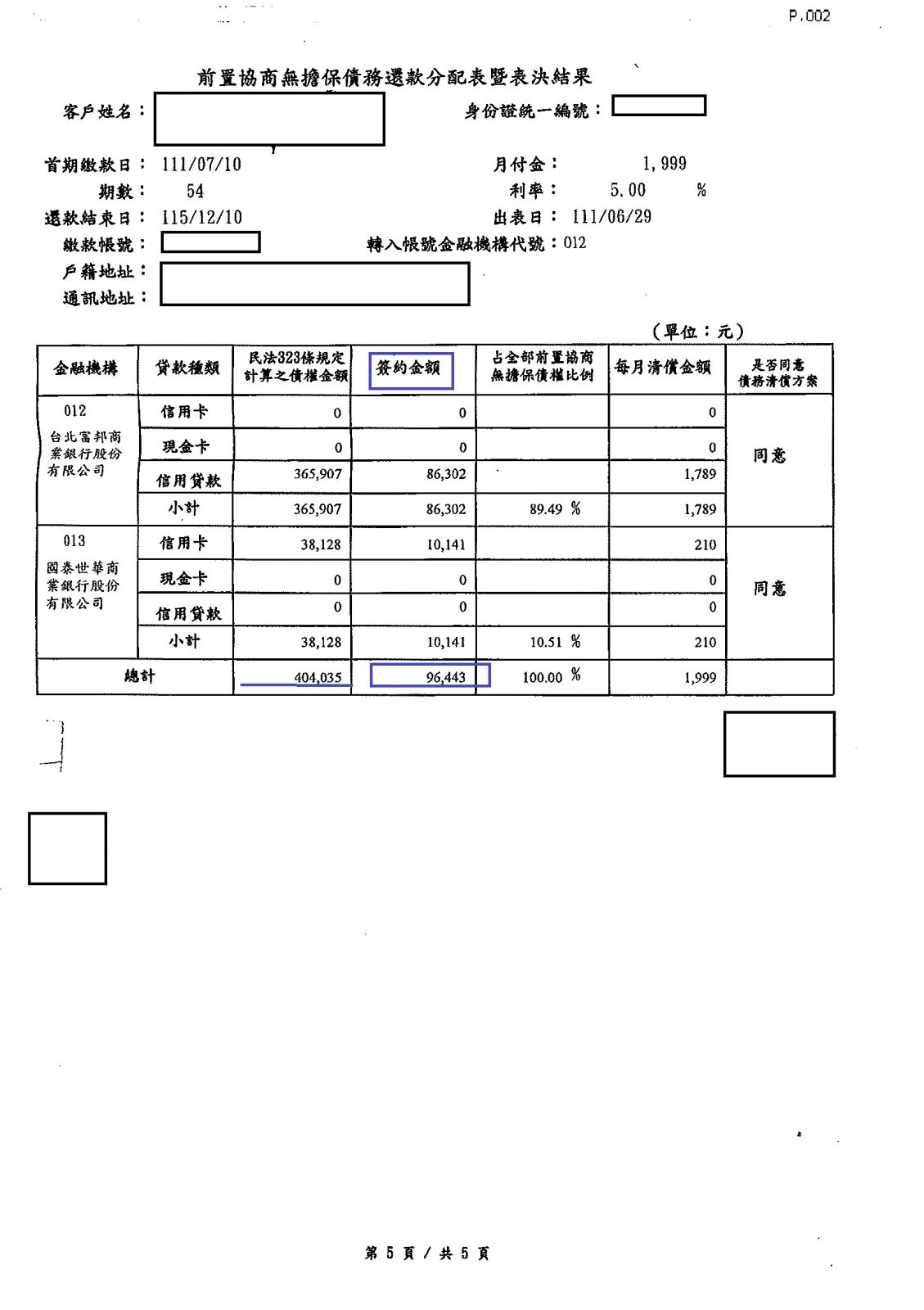 【前置協商案例】- 高小姐本金加利息負債約40萬4035元,前置協商後減免12年來利息,以本金分54期5%每月繳款1,999元。