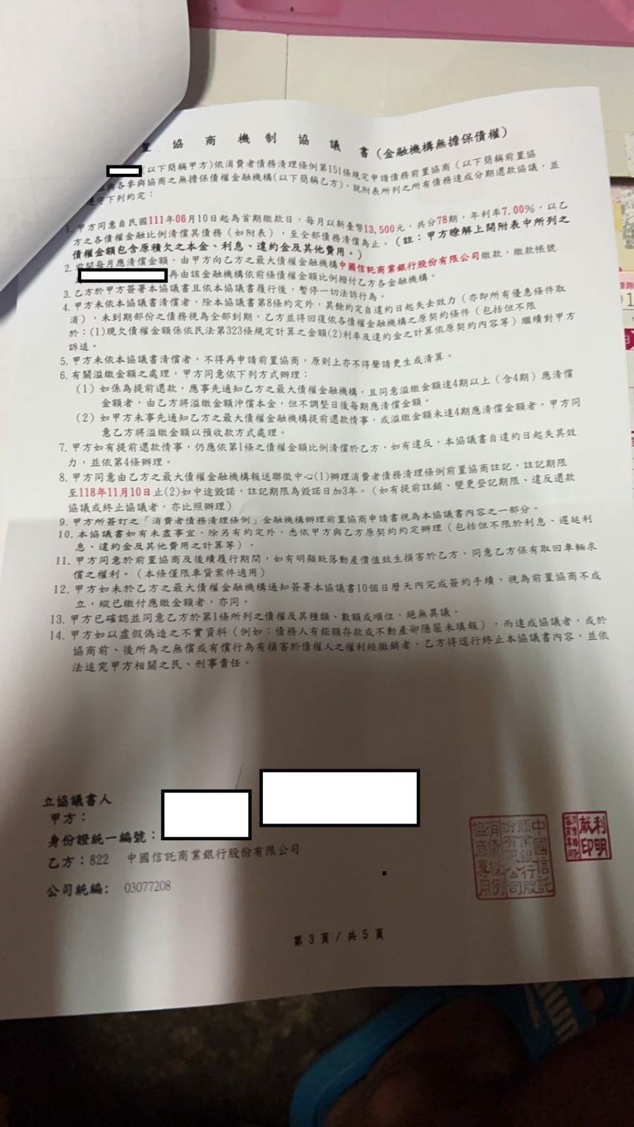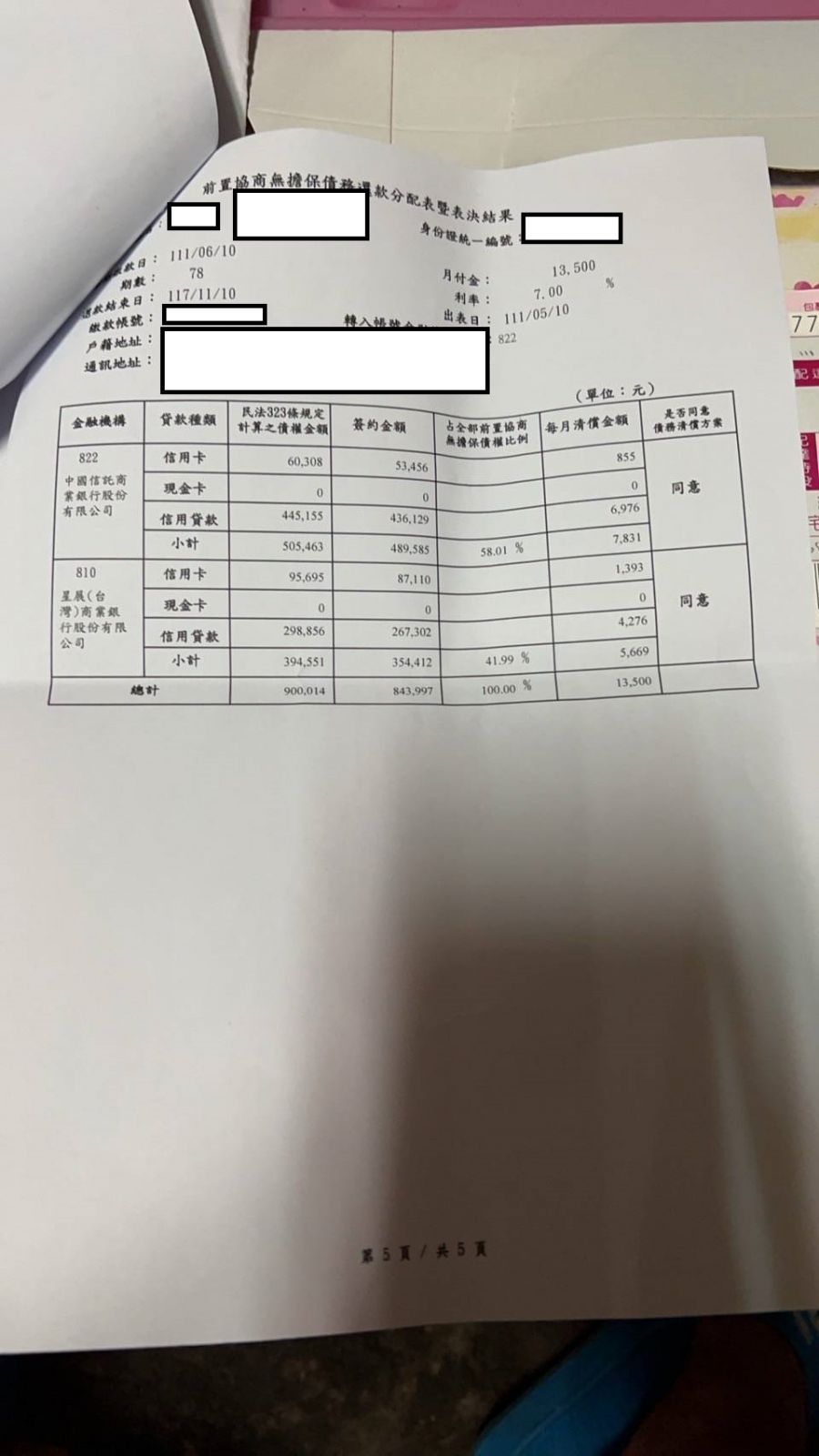 【前置協商案例】- 李先生債務約136萬,5間銀行每月繳納銀行最低應繳額約4萬3,整合協商後每月還款1萬3600元。
