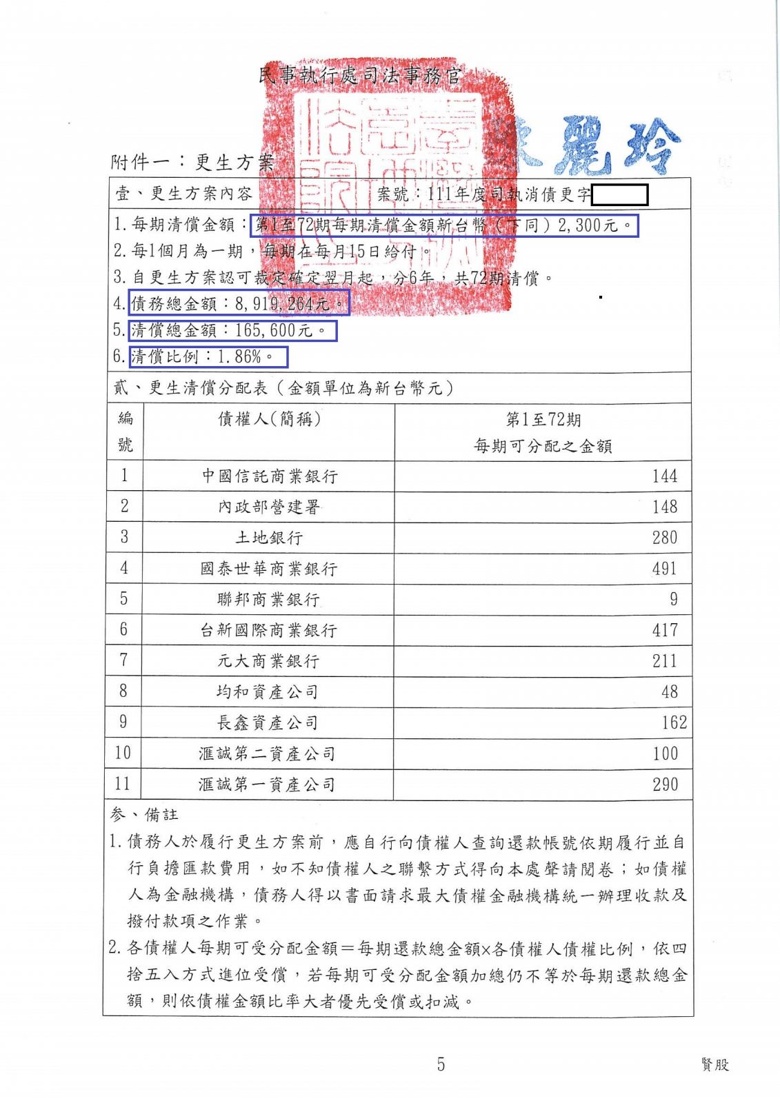 【債務更生案例】 劉先生負債總額1035萬8824元,法院更生成立後每月還款1800元,6年還款總額7萬2,清償比例:1.25 %