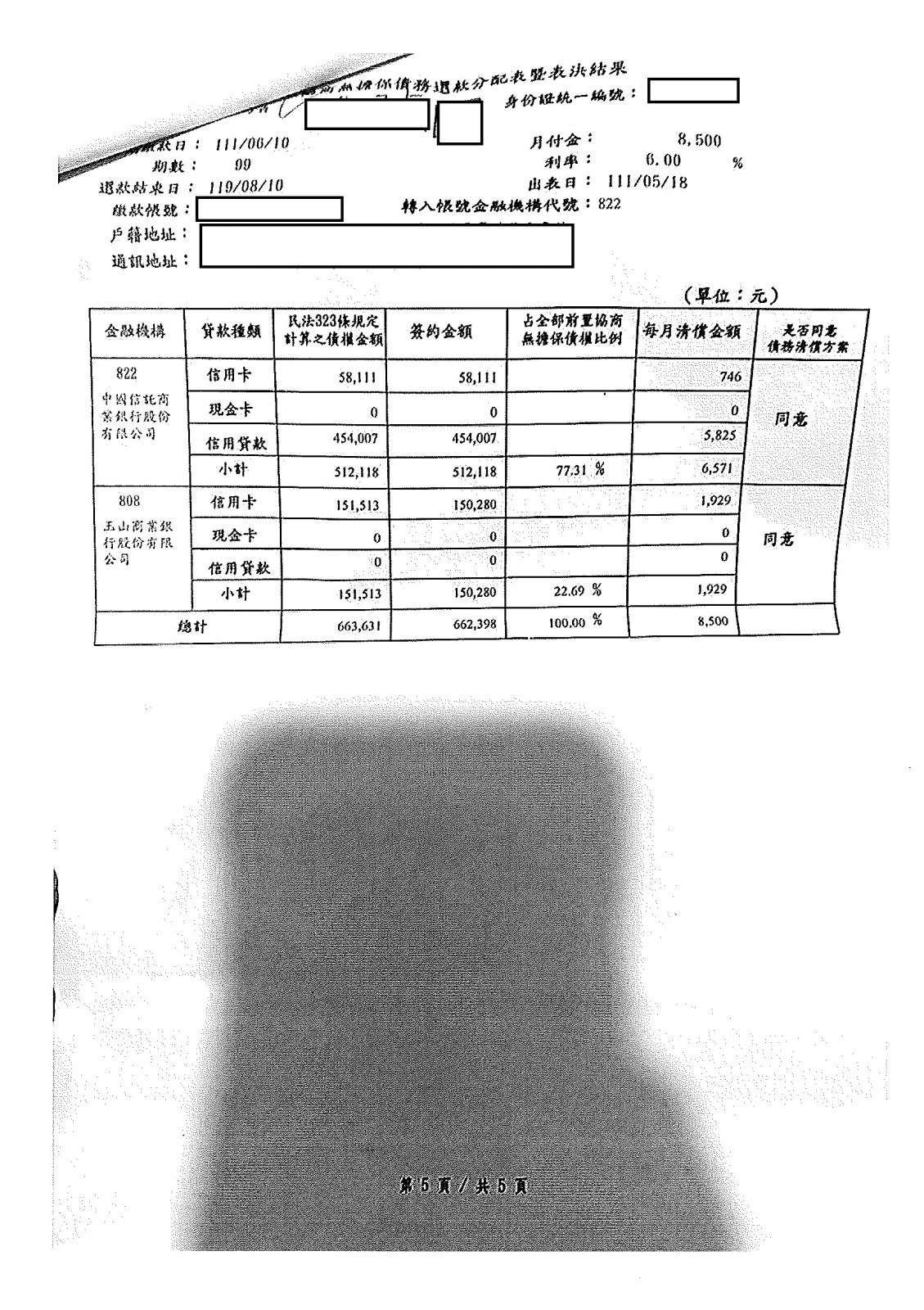 【債務更生案例】 -于小姐負債總額約216萬4609元,法院更生成立後每月還款1693元(3個月為一期5079元),6年還款總額12萬1896元,清償比例:5.63%