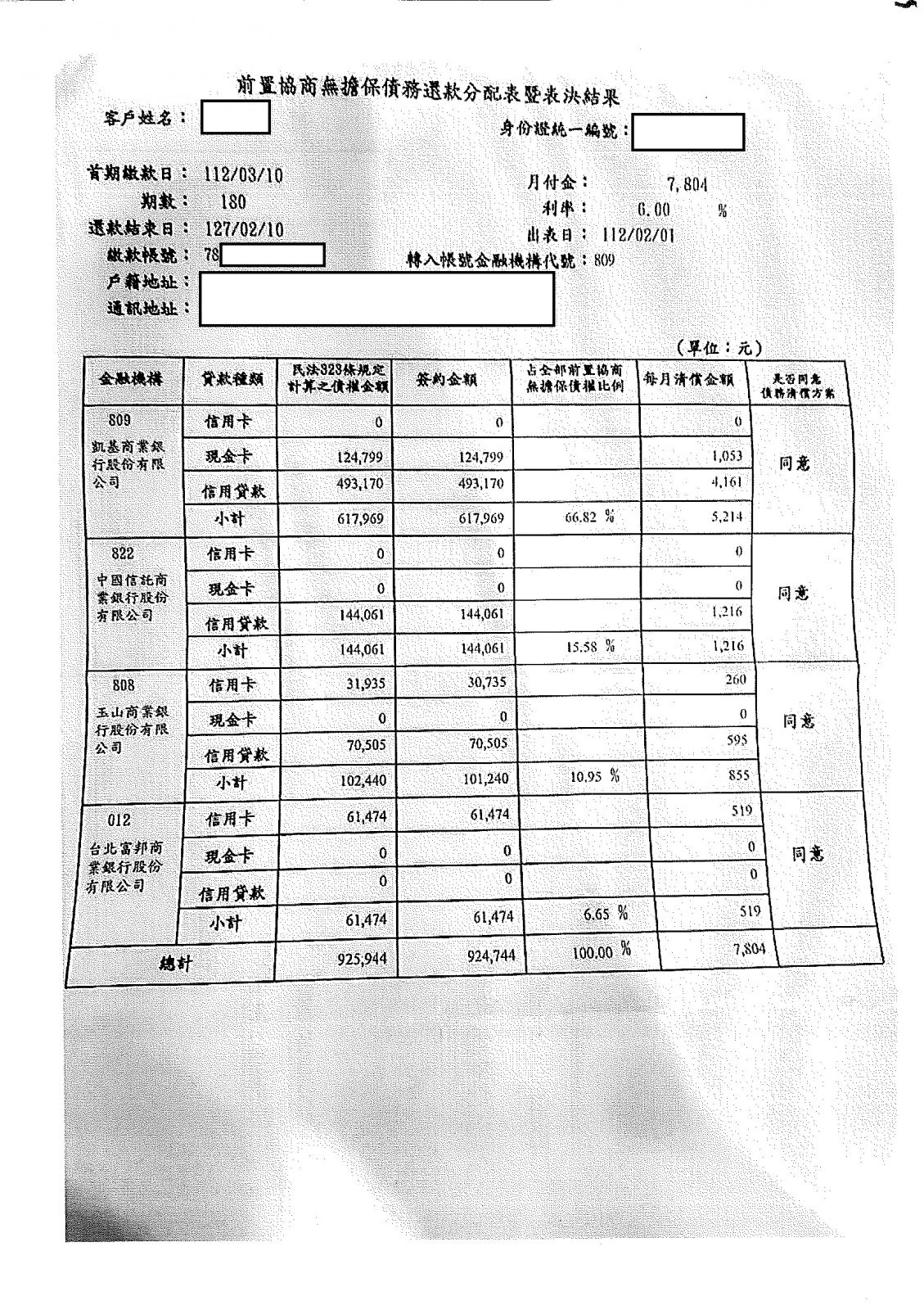 【前置協商案例】- 柯小姐債務約92萬5944元,每月繳納各家最低應繳額約4萬3,整合協商後每月還款7,804元。