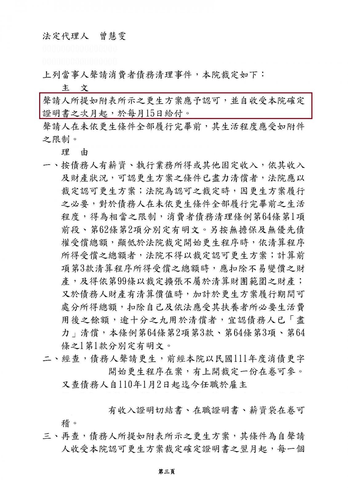 【債務更生案例】 謝小姐負債總額490萬3342元,法院更生成立後每月還款3,000元,6年還款總額21萬6000,清償比例:4.41%