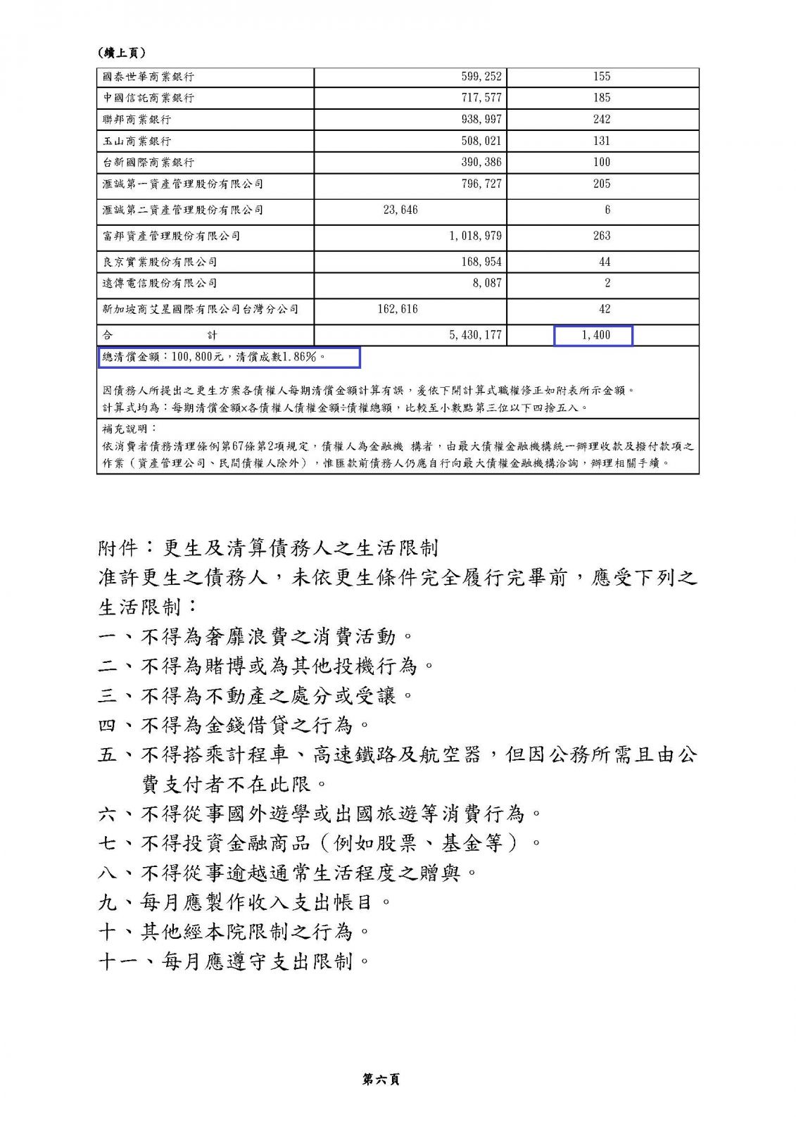 【債務更生案例】 廖小姐負債總額110萬1642元,法院更生成立後每月還款1,000元,6年還款總額7萬2000,清償比例:6.53%