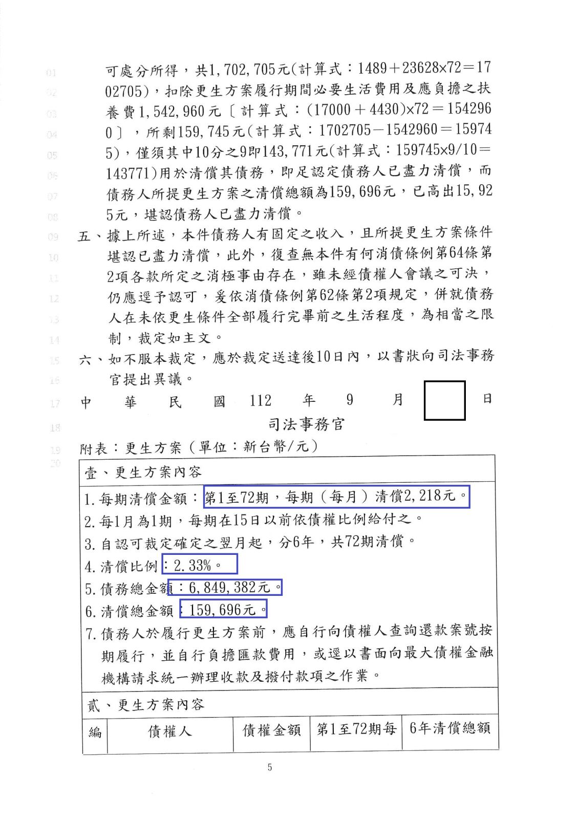 【債務更生案例】 -于小姐負債總額約216萬4609元,法院更生成立後每月還款1693元(3個月為一期5079元),6年還款總額12萬1896元,清償比例:5.63%