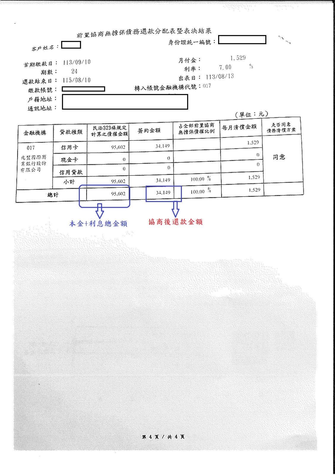 【前置協商案例】- 張小姐本金加利息負債約24萬6136元,前置協商後減免3年來利息,以本金17萬612元還款,每月還款1965元。