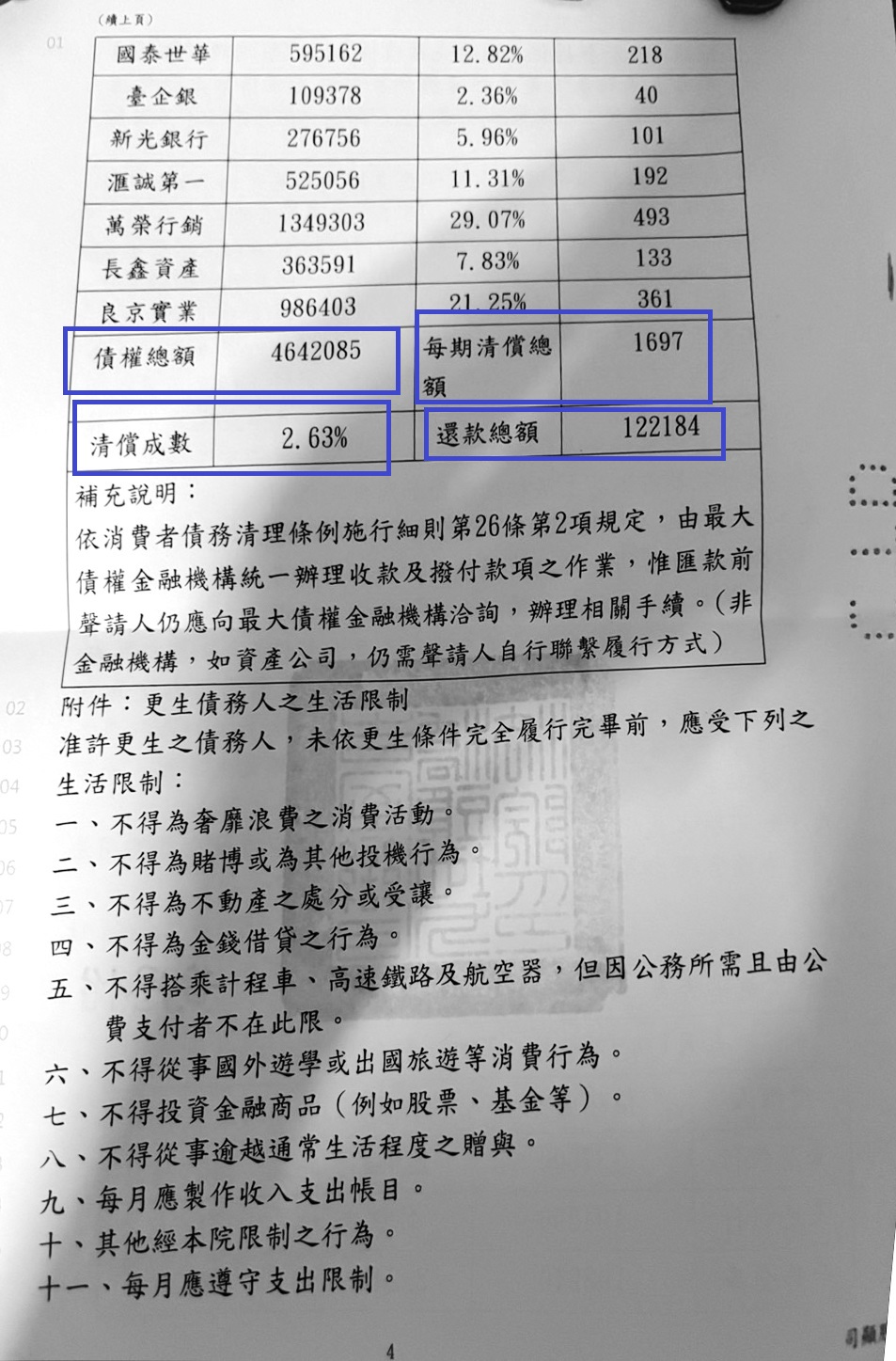 【債務更生案例】 -于小姐負債總額約216萬4609元,法院更生成立後每月還款1693元(3個月為一期5079元),6年還款總額12萬1896元,清償比例:5.63%