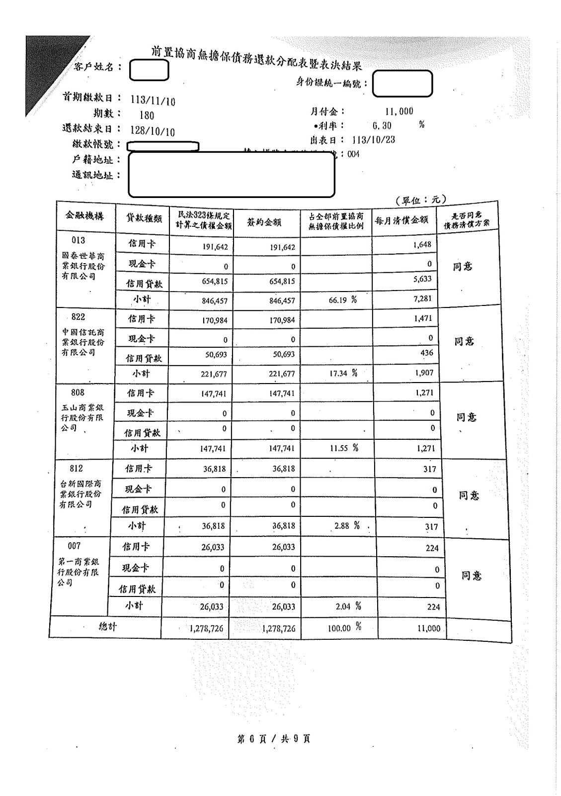 【債務更生案例】 廖小姐負債總額110萬1642元,法院更生成立後每月還款1,000元,6年還款總額7萬2000,清償比例:6.53%