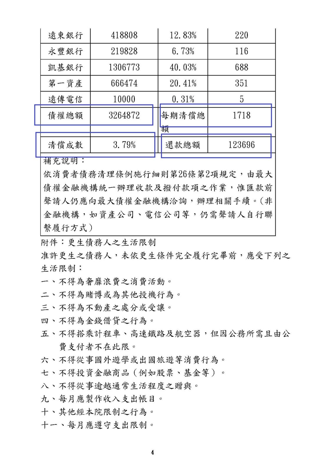 萬3696元,清償比例約3.79%,餘債務金額免除。