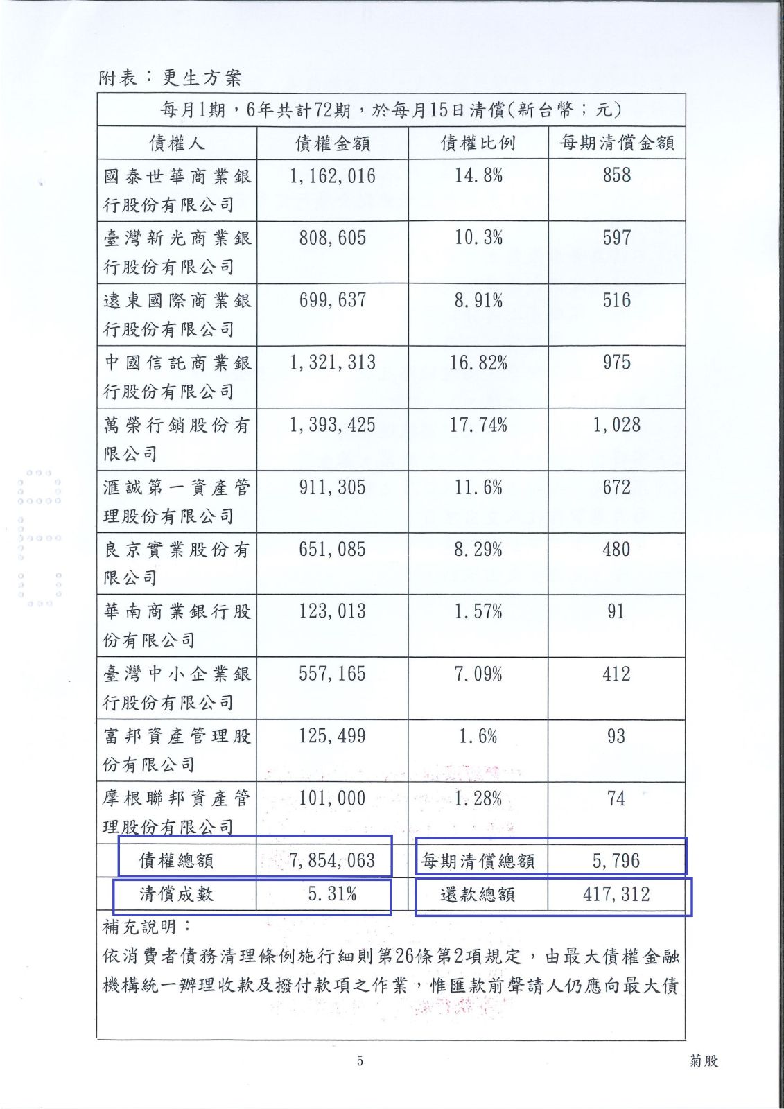 【債務更生案例】 蔡先生負債總額785萬4063元,法院更生成立後每月還款5,796元,6年還款總額41萬7312,清償比例:5.31%