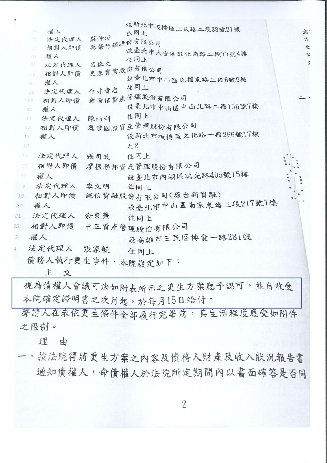 【債務更生案例】 劉先生負債總額1035萬8824元,法院更生成立後每月還款1800元,6年還款總額7萬2,清償比例:1.25 %
