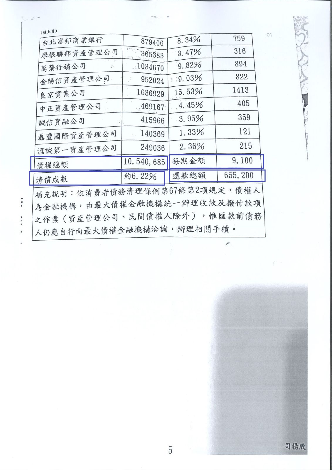 【債務更生案例】 -于小姐負債總額約216萬4609元,法院更生成立後每月還款1693元(3個月為一期5079元),6年還款總額12萬1896元,清償比例:5.63%