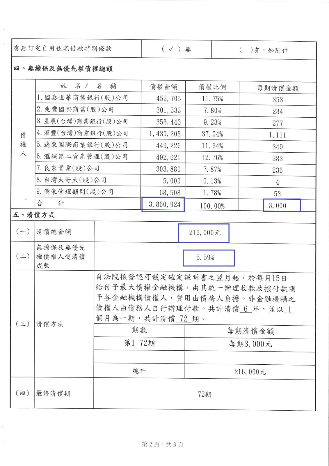 裁定其以第1-72期每個月為一期,每月還款3000元,