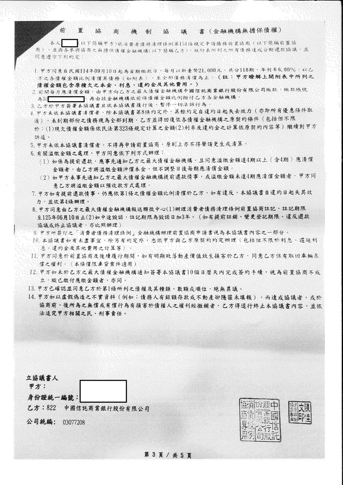 【前置協商案例】- 樊先生本金加利息負債約457萬5661元,前置協商後減免8年來利息,以本金128萬7802元還款,每月還款8893元。