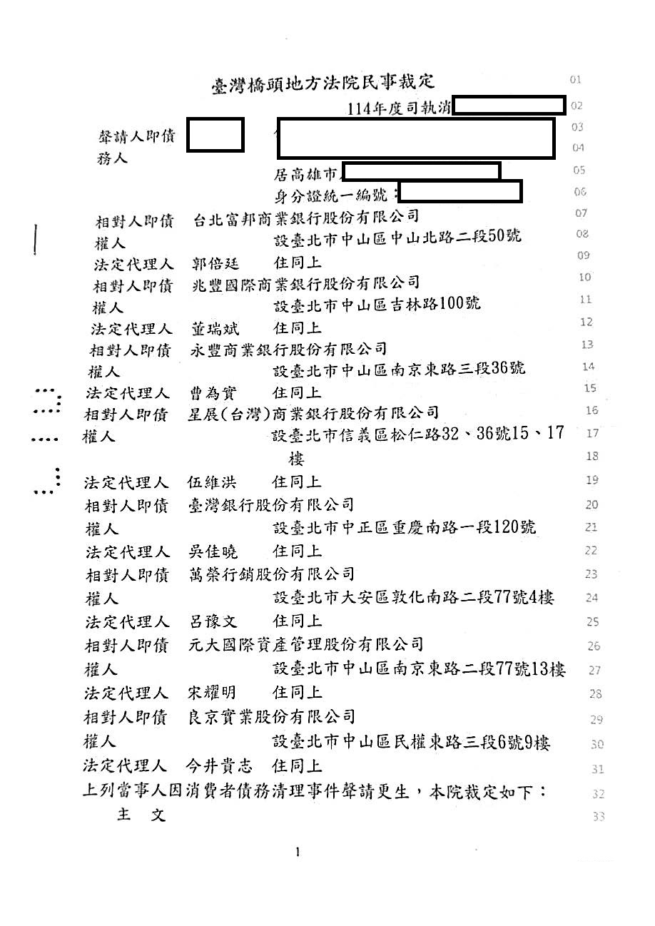 【債務更生案例】 劉先生負債總額1035萬8824元,法院更生成立後每月還款1800元,6年還款總額7萬2,清償比例:1.25 %