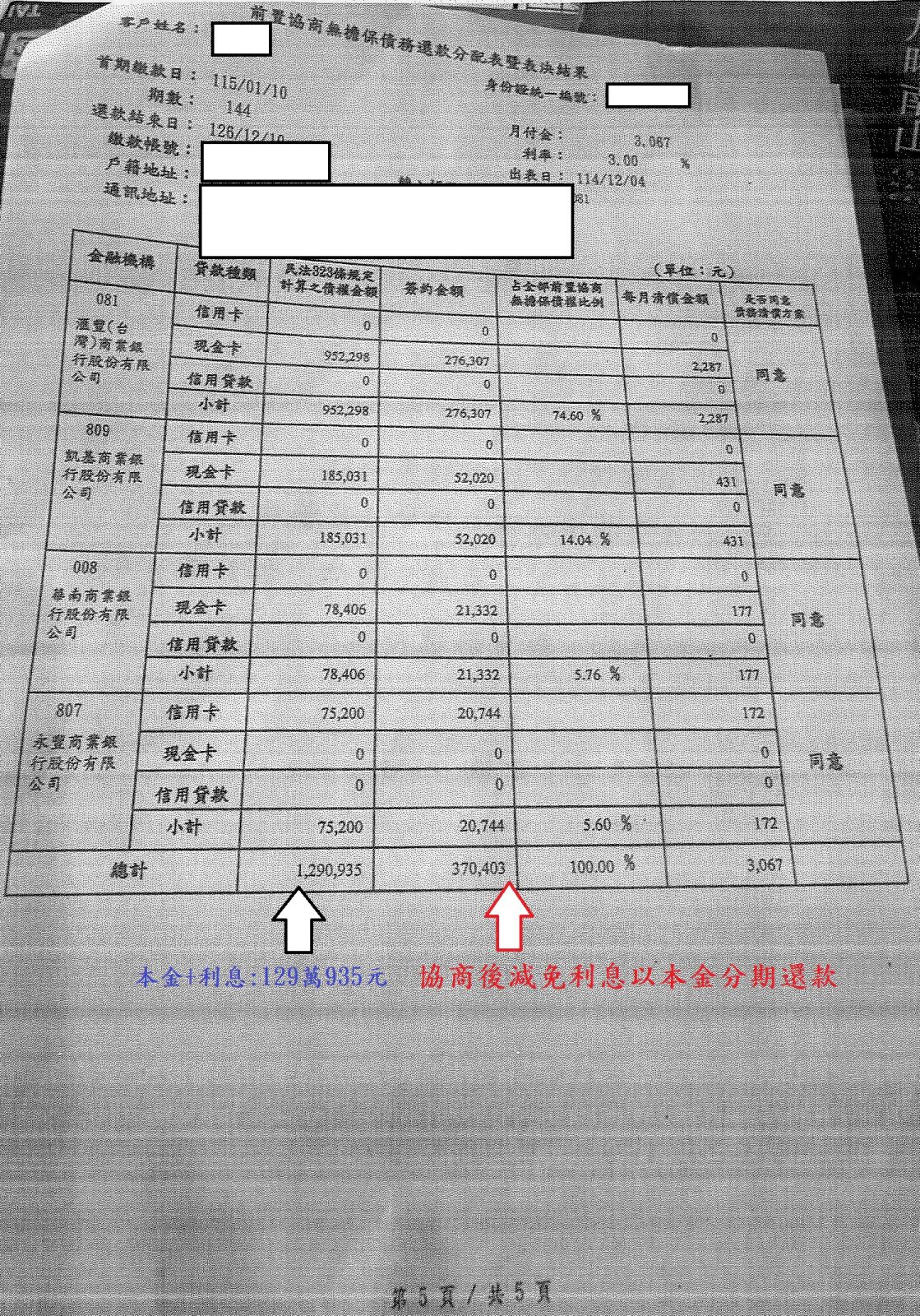 【前置協商案例】- 廖小姐本金加利息負債約129萬935元,前置協商後減免13年來利息,以本金37萬403元還款,每月還款3067元。
