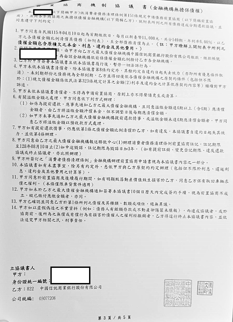 【前置協商案例】- 范姜先生債務約102萬7826元,每月繳納銀行最低應繳額約3萬,整合協商後每月還款1萬1500元。