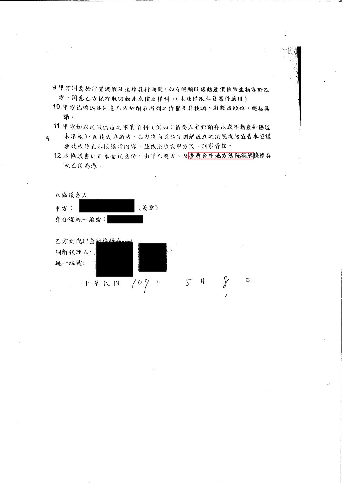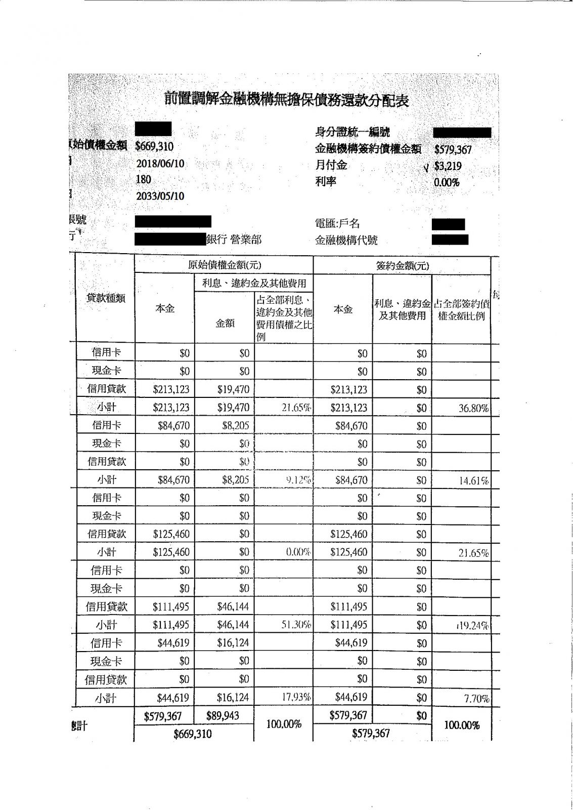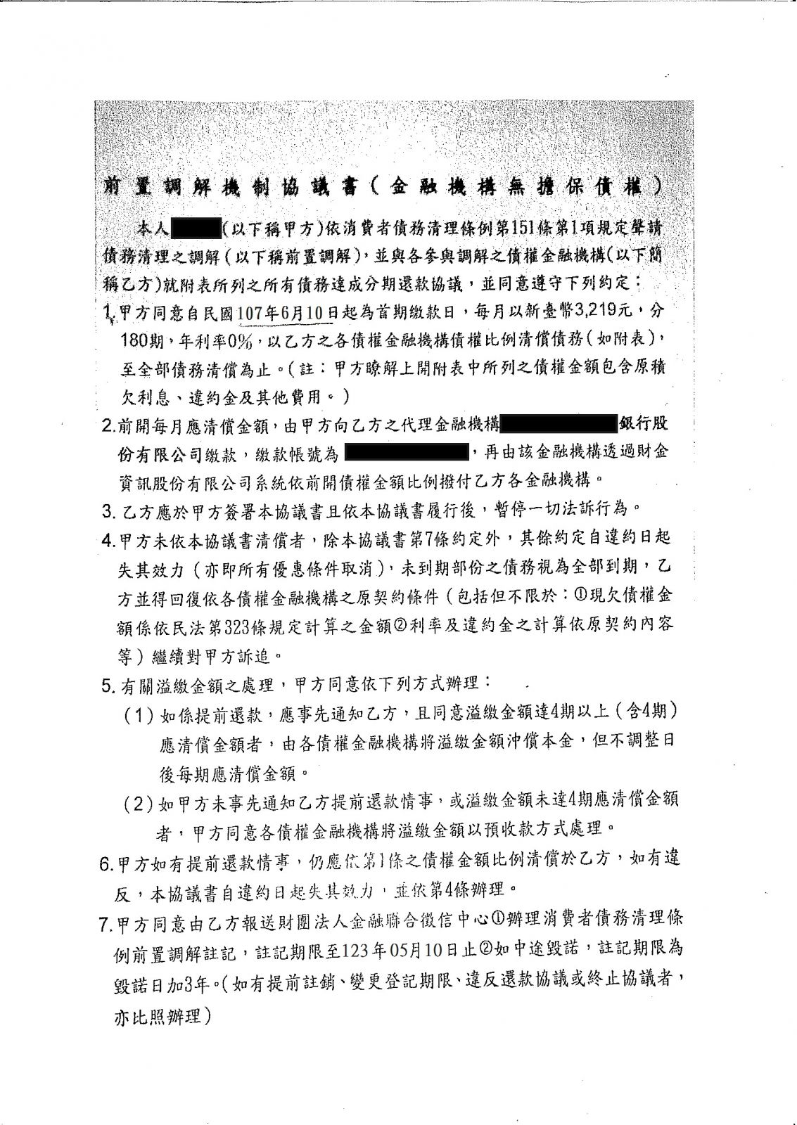 【前置調解案例】 - 前置調解完成,首期繳款日:107年6月10日,180期、利率0%、月繳3,219元
